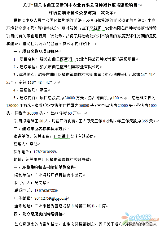 關(guān)于“韶關(guān)市曲江區(qū)新潤(rùn)豐農(nóng)業(yè)有限公司種豬養(yǎng)殖場(chǎng)建設(shè)項(xiàng)目”環(huán)境影響評(píng)價(jià)公眾參與第一次公示